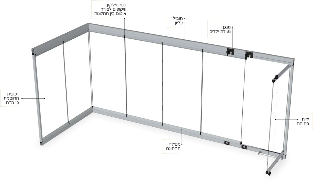 מנגנון ההזזה המתקדם והנוח של המערכת שלנו מאפשר לך לשלוט על האקלים במרפסת שלך. לפתוח את המרפסת לכל אורכה בקיץ כדי לאפשר כניסה של אוויר ולסגור אותה בסערות הגשמים של החורף כדי לשמור על המרפסת שלך יבשה ונקייה.